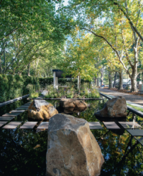 Organic bluestone boulders are sliced to expose a smooth paving surface closely contrasted by natural rock face and earthing details. This is basalt bluestone in a natural format. Unique in formation – no two rocks are the same in characteristics.
